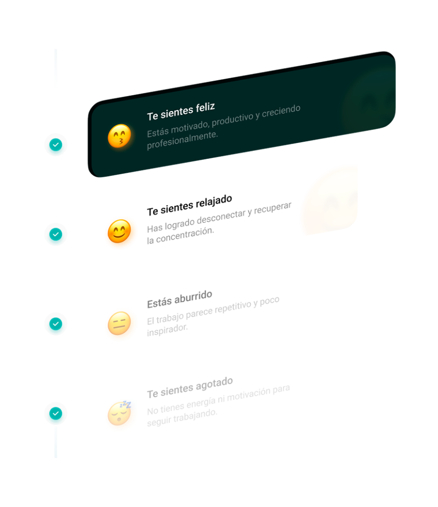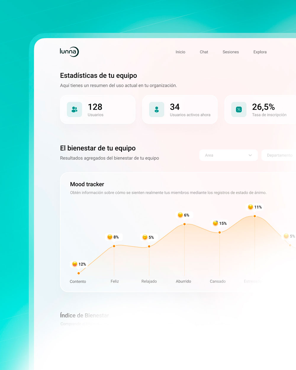 Nuestro panel de control ofrece métricas claras y anónimas sobre el bienestar de tu equipo y las áreas de mayor necesidad. Esto te permitirá evaluar el impacto de Lunna y tomar decisiones basadas en datos.