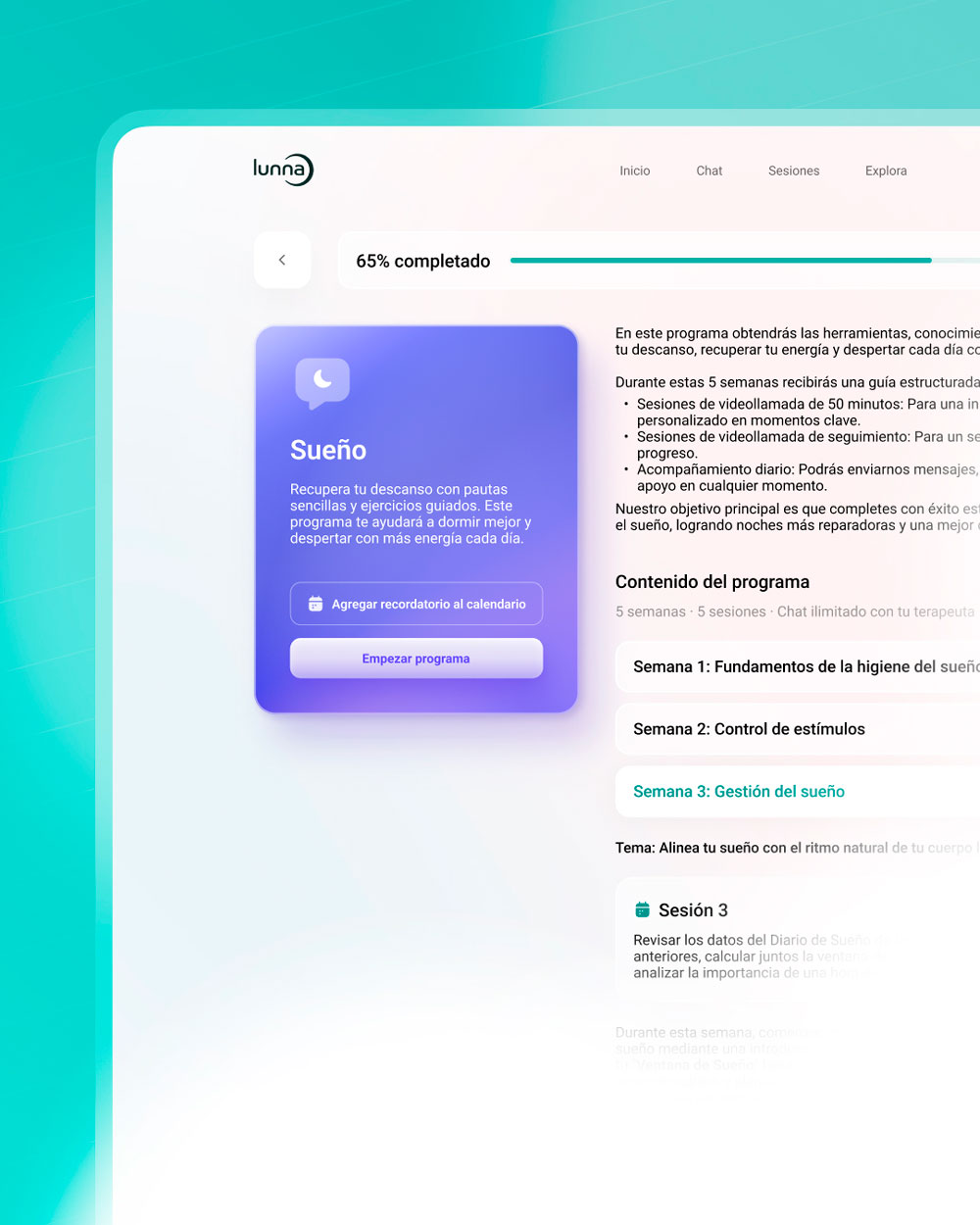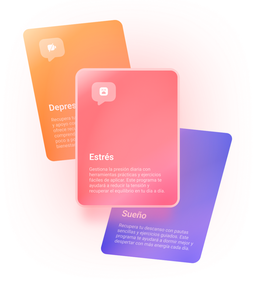 Cada usuario accede a un espacio seguro y privado donde puede cuidar de su salud mental sin barreras. Desde programas guiados para gestionar el estrés, la ansiedad o el insomnio, hasta sesiones de coaching para desarrollar habilidades profesionales.